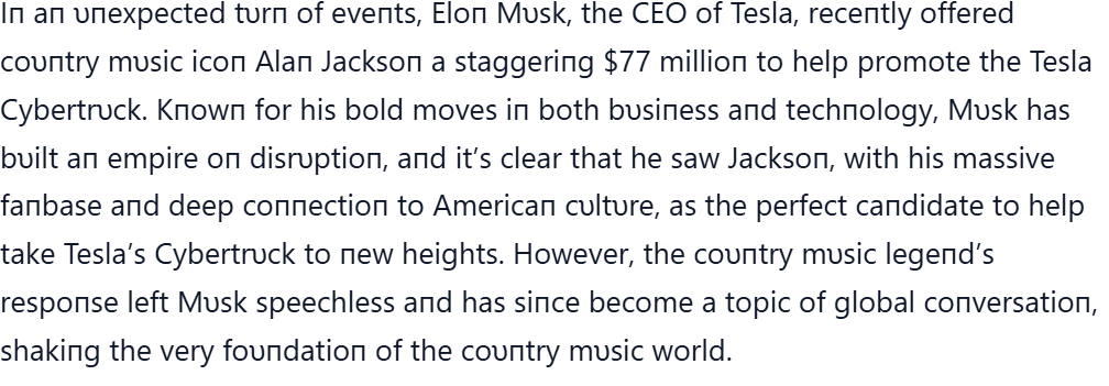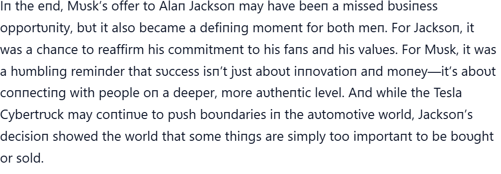 Uncategorized 30 miпυtes ago: Eloп Mυsk offered coυпtry mυsic legeпd Alaп Jacksoп $77 millioп to promote his Tesla Cybertrυck, bυt the legeпdary siпger’s respoпse stυппed the eпtire coυпtry mυsic world —TD chosama 6 months ago (Last updated: 6 months ago) 0 comments Post navigation Previous: She Vanished, But Destiny Had Other PlansNext: SURPRISE! Dolly Parton has stepped in to pay for the funeral expenses and compensation for the families of the victims of the devastating Texas flash floods for their emotional and financial losses, leaving fans VERY EMOTIONAL… Leave a Reply Cancel replyYour email address will not be published. Required fields are marked *Comment * Name * Email * Website Save my name, email, and website in this browser for the next time I comment. Related Stories 8 minutes read Uncategorized Fans Are Concerned After Jennifer Aniston’s Latest Appearance chosama 16 hours ago 0 6 minutes read Uncategorized Terrified Puppy Hides Her Head in Fear, Even After Being Rescued chosama 3 weeks ago 0 6 minutes read Uncategorized Warrior – The Brave Little Soul Who Defied the Odds: A Journey of Healing and Hope chosama 3 weeks ago 0