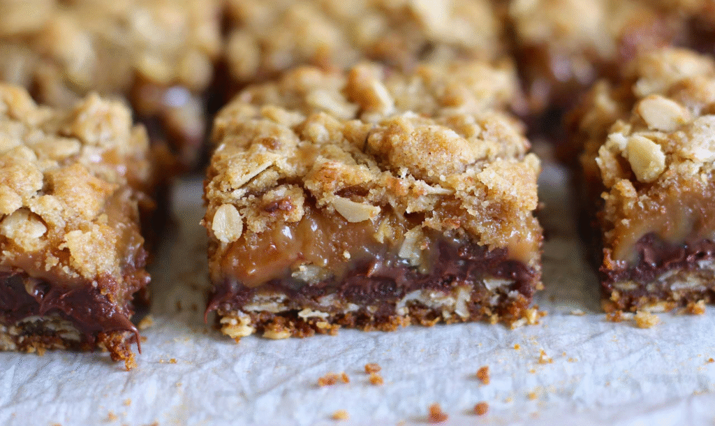Take the crust out of the oven and sprinkle a cup of chocolate chips over the top and then pour the melted caramel over them. The final step will be sprinkling the remaining oat mixture on top and baking the bars for an additional 18-20 minutes. We do recommend waiting until the bars have fully cooled to cut into them. It may seem like an impossible task, but it will help them keep their shape. The final results are absolutely worth the wait! Make them for your next special occasion and we’re sure you’ll agree!