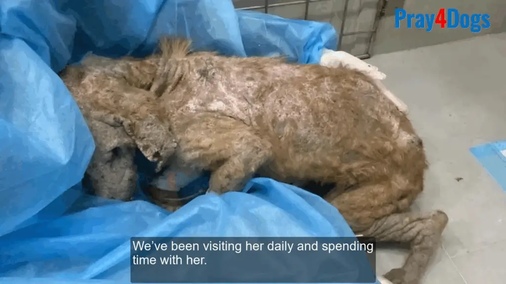 Mange had stripped away patches of her fur, leaving painful sores across her skin. Open wounds revealed the toll of long-term neglect.