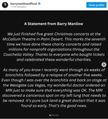 According to Manilow, an MRI ordered as a precaution revealed a small cancerous spot on his left lung. Doctors believe the cancer has not spread, and treatment will involve surgery only, with no chemotherapy or radiation currently planned. Manilow credited early detection, good medical care, and “pure luck” for the positive outlook, even adding humor by noting his recovery plan would include rest, chicken soup, and classic TV reruns.